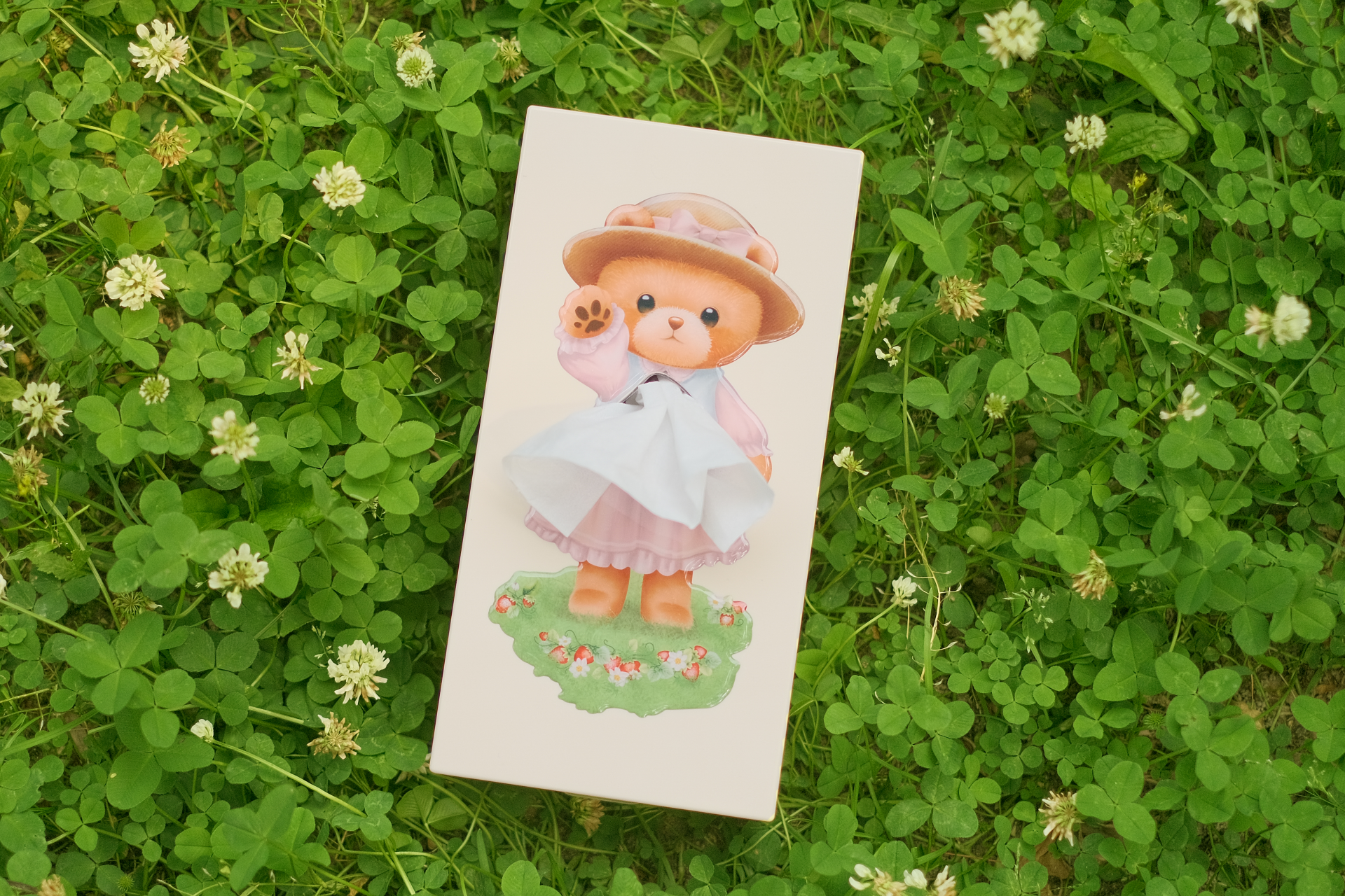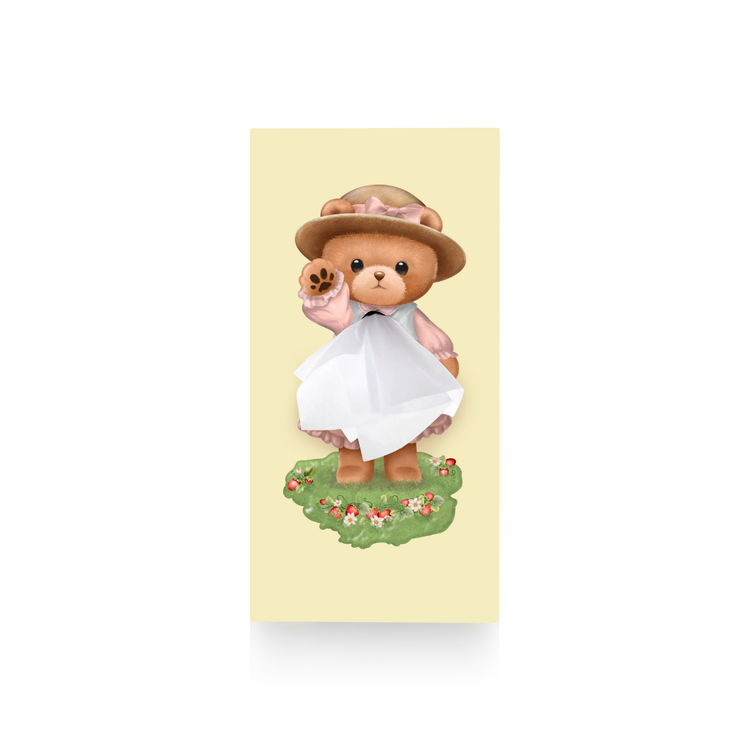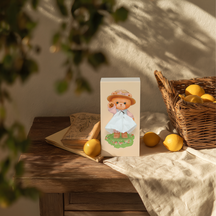Dressed in a delicate pink dress and matching hat, this sweet little bear brings timeless charm and a touch of countryside innocence to your decor. The tissue emerges as the flowing fabric of her dress, creating a delightful and functional design.