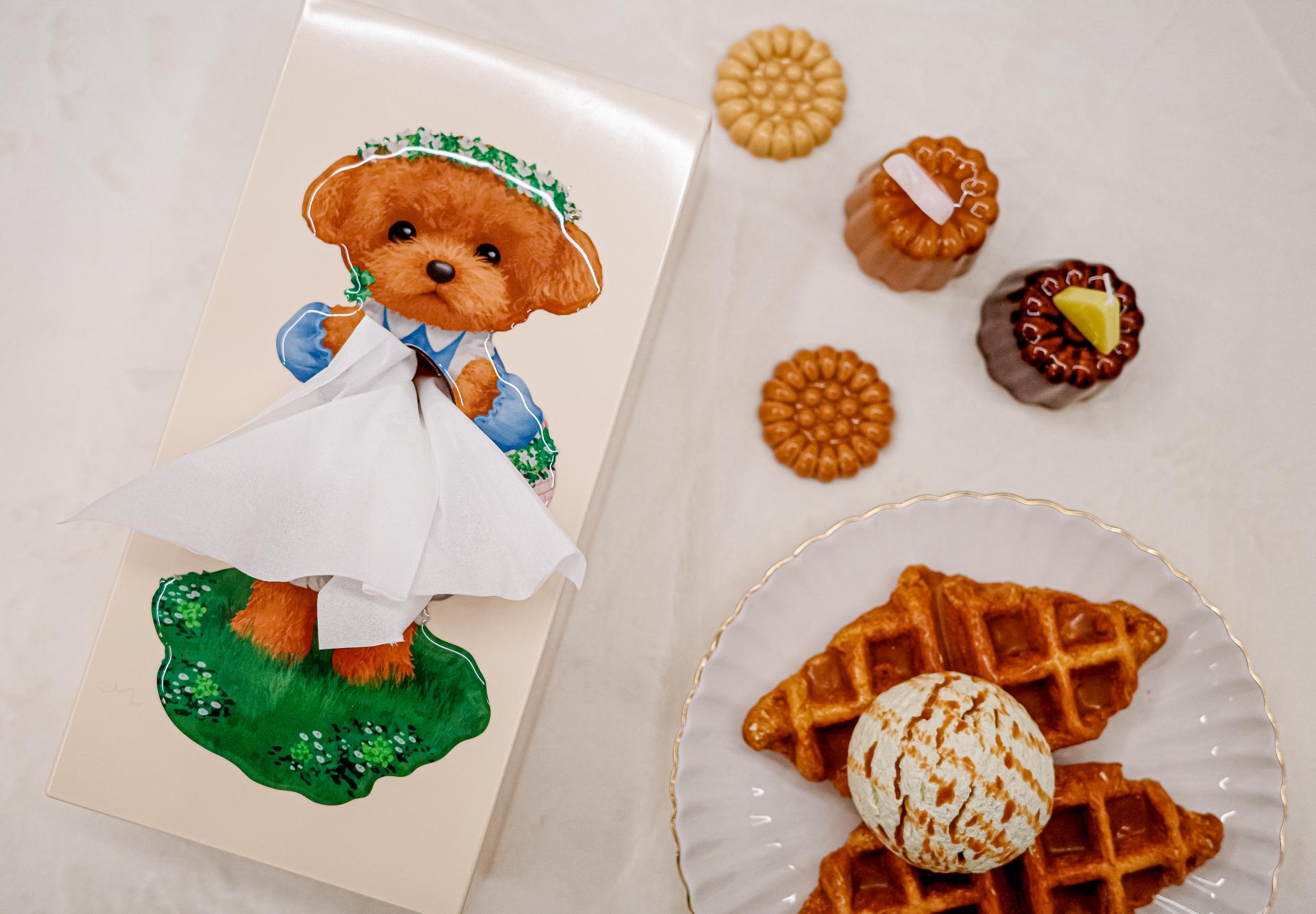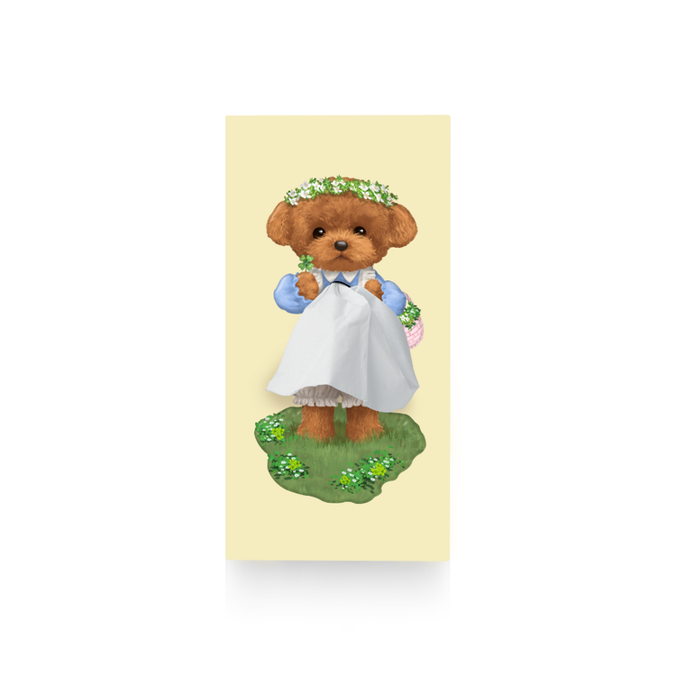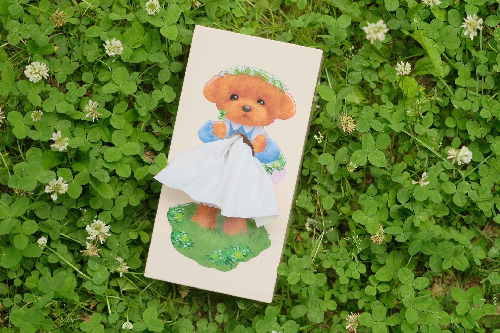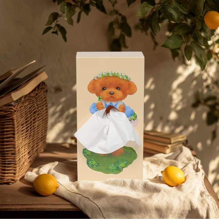 With a sweet daisy crown, soft blue sleeves, and a tiny clover in paw, this gentle pup turns a simple tissue into a storybook apron. Standing on a patch of clover-strewn grass, she's ready to melt hearts and brighten shelves.