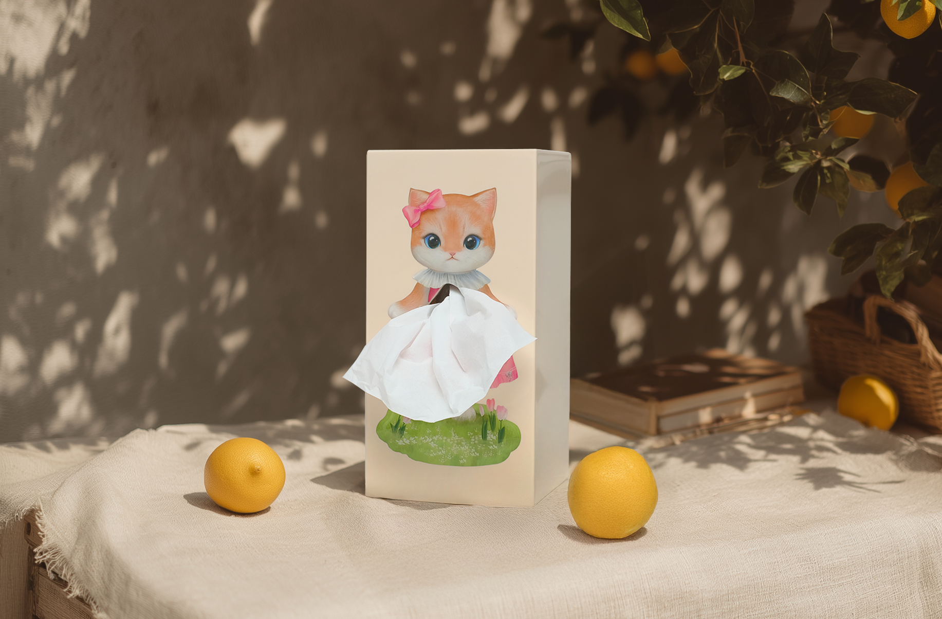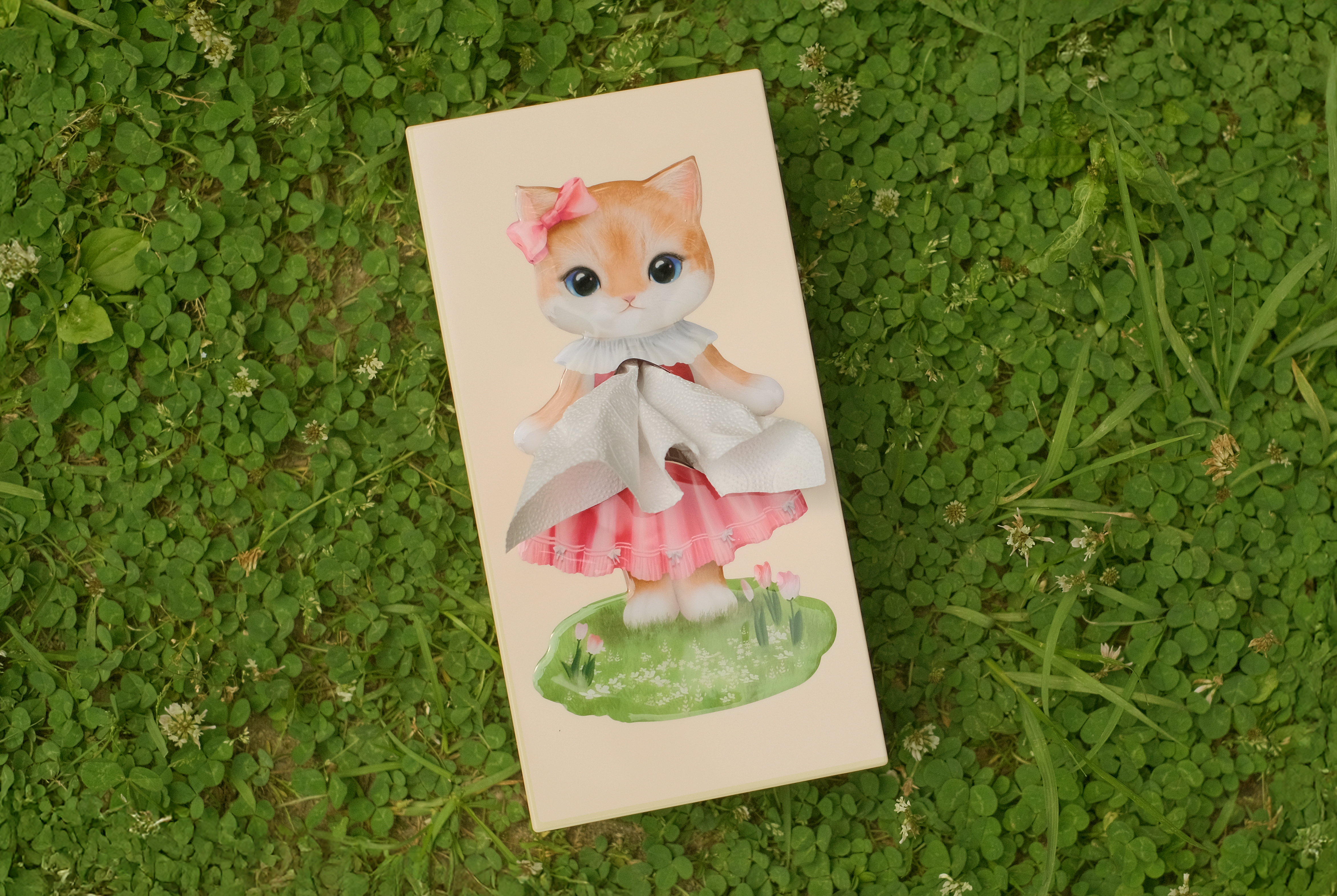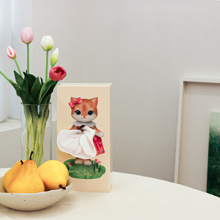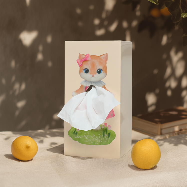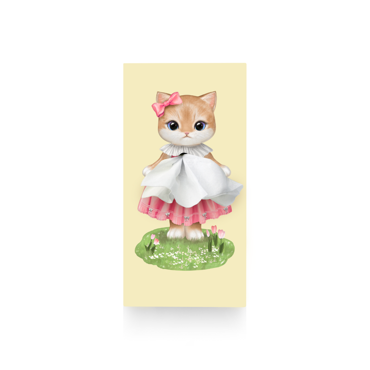 This adorable kitten, dressed in a sweet pink dress with a delicate bow, uses the flowing tissue as part of her playful outfit. With her wide sparkling eyes and soft pastel background, she instantly brightens any room.